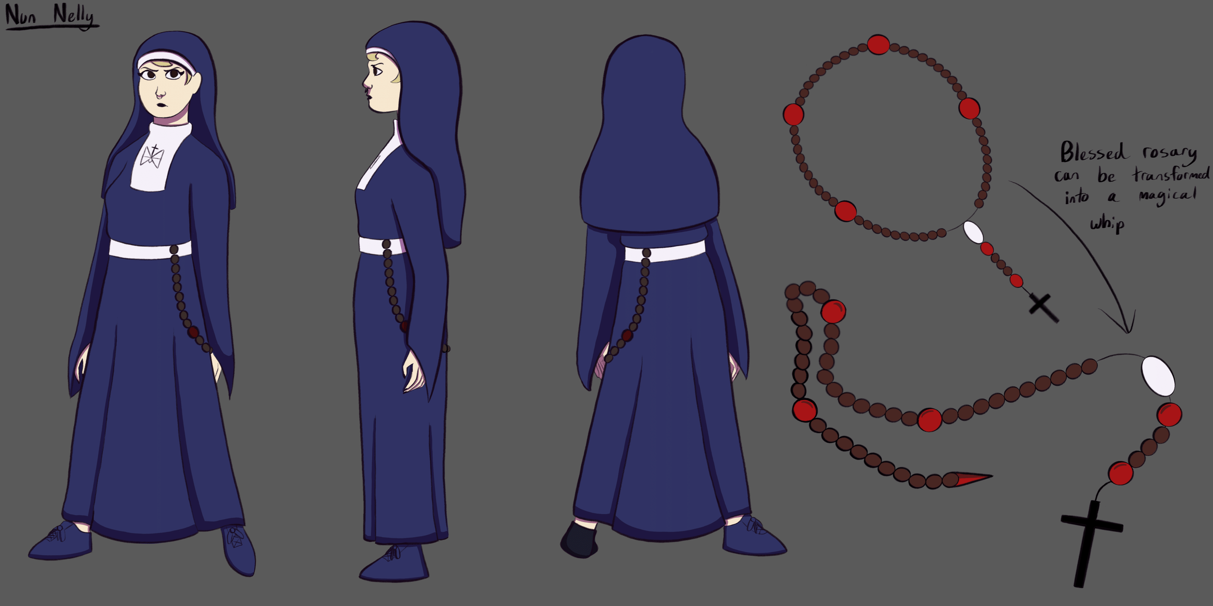 Here is concept work for a comic idea about a punk rocker who becomes a demon-slaying nun!